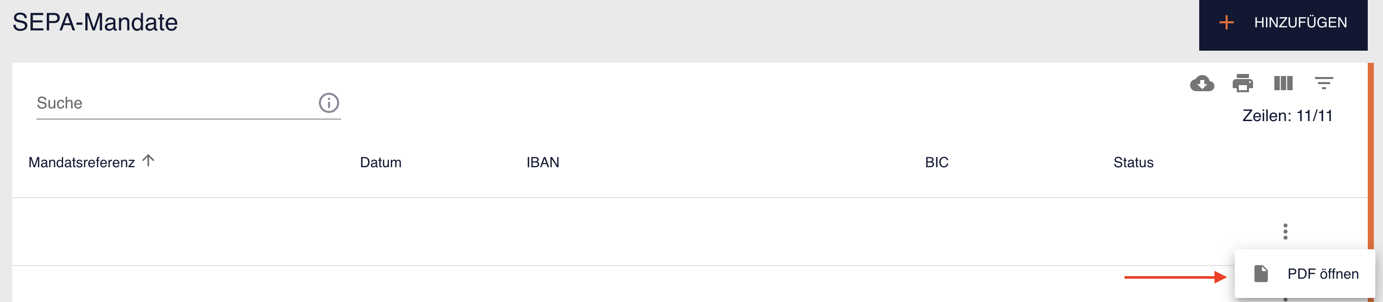 Sie können sich jedes SEPA-Lastschriftmandat als PDF exportieren lassen über das drei Punkte Menü in der Tabelle.