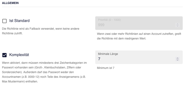 Wenn aktiviert, dann müssen mindestens drei Zeichenkategorien im Passwort vorhanden sein (Groß-, Kleinbuchstaben, Ziffern oder Sonderzeichen). Außerdem darf das Passwort weder den Accountnamen (z.B. 0000-12) noch Teile des Anzeigenamens (z.B. Max Mustermann) enthalten.