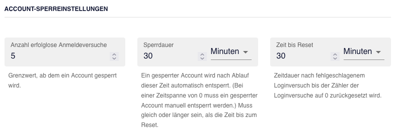 Ein gesperrter Account wird nach Ablauf dieser Zeit automatisch entsperrt. (Bei einer Zeitspanne von 0 muss ein gesperrter Account manuell entsperrt werden.) Muss gleich oder länger sein, als die Zeit bis zum Reset.