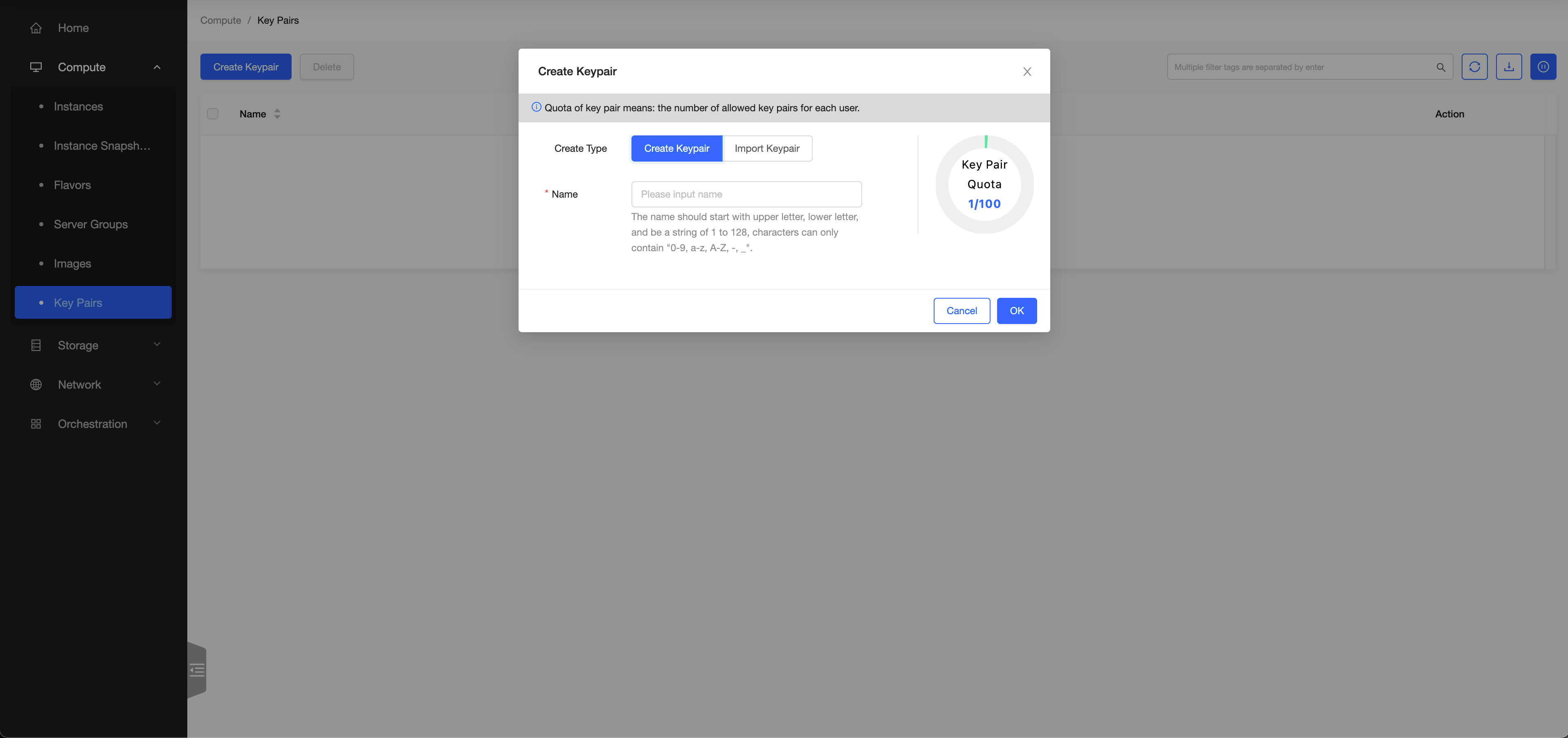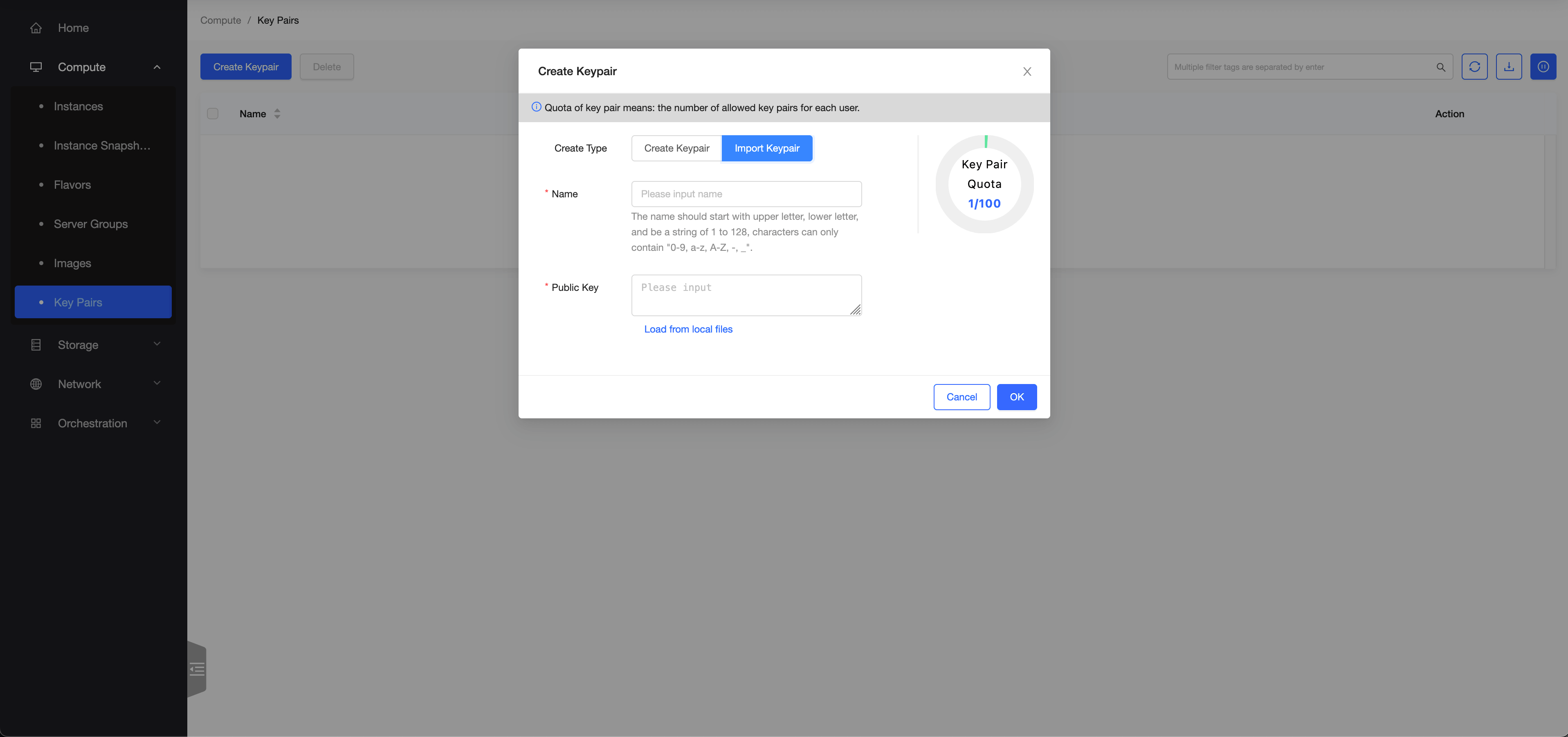 Unter dem Menüpunkt Compute / Key Pairs können Schlüssel Paare verwaltet werden. Diese können, sofern vom Image unterstützt, beim Erstellen einer Instance automatisiert für den initialen Nutzer innerhalb der Instance hinterlegt werden. Über die Schaltfläche „Create Keypair“ ist sowohl das Erstellen als auch das Importieren von Schlüssel Paaren möglich.