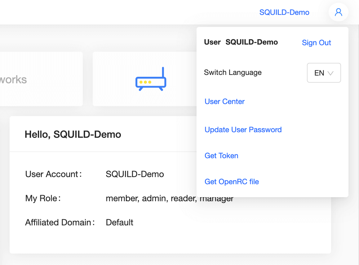 Im oberen Bereich jeder Seite befindet sich eine Menü Leiste, die am linken Ende das aktuelle Projekt sowie am rechten Ende den angemeldeten Nutzer anzeigt. Durch Überfliegen des Nutzer-Symbols mit der Maus öffnet sich ein Dialog, der eine Abmeldung („Sign Out“) ermöglicht.