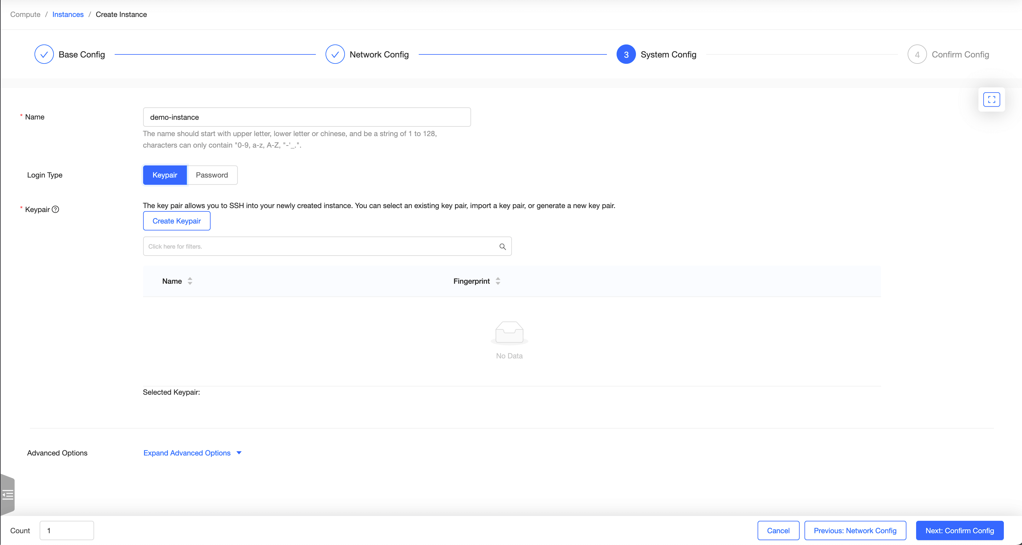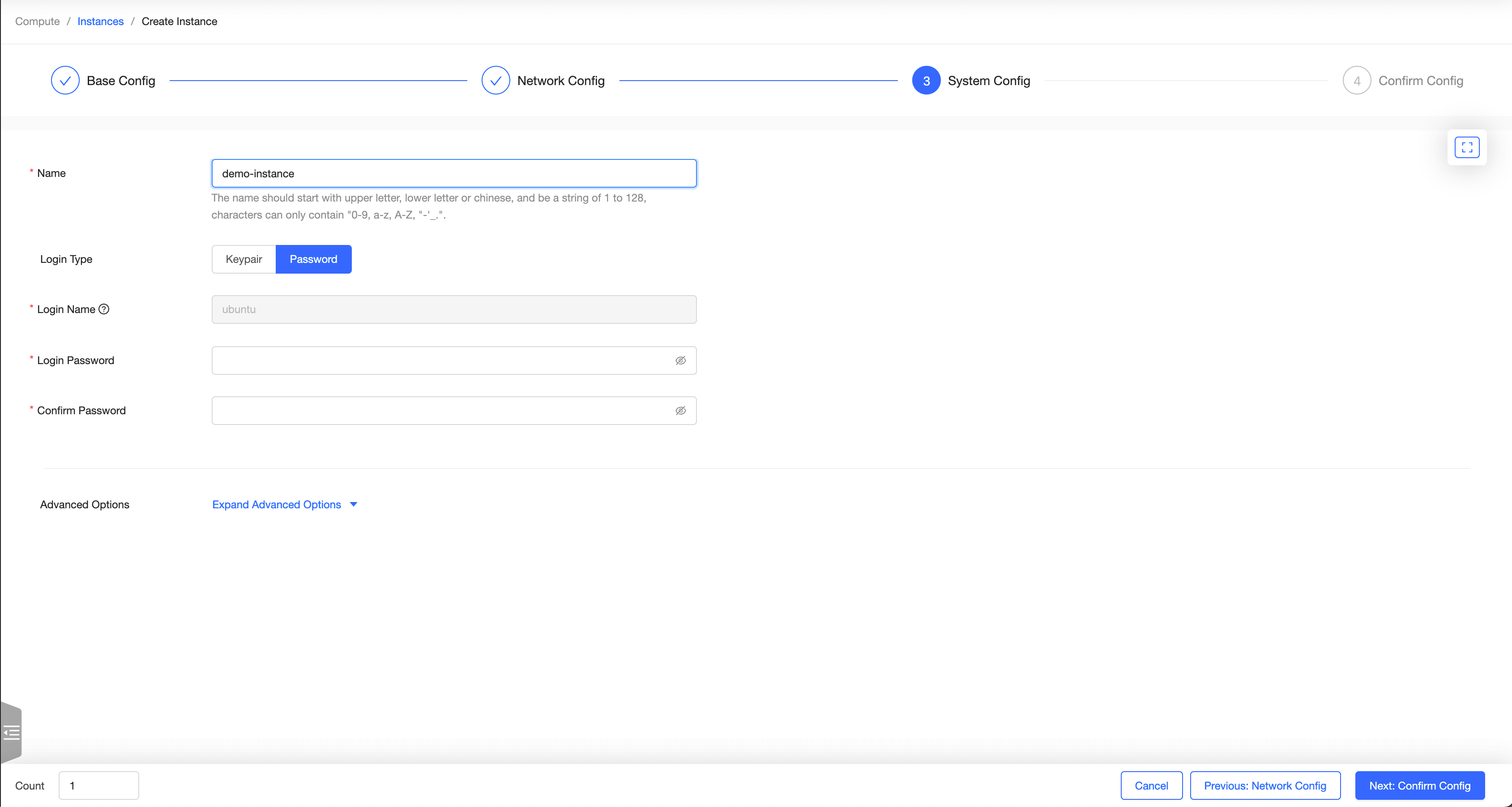 Beim Login Type kann zwischen Keypair (Private-Public-Keys bei Zugriff über SSH Key Challenge) und Password (Login mit Nutzername und Passwort; Remote Desktop oder SSH) gewählt werden.