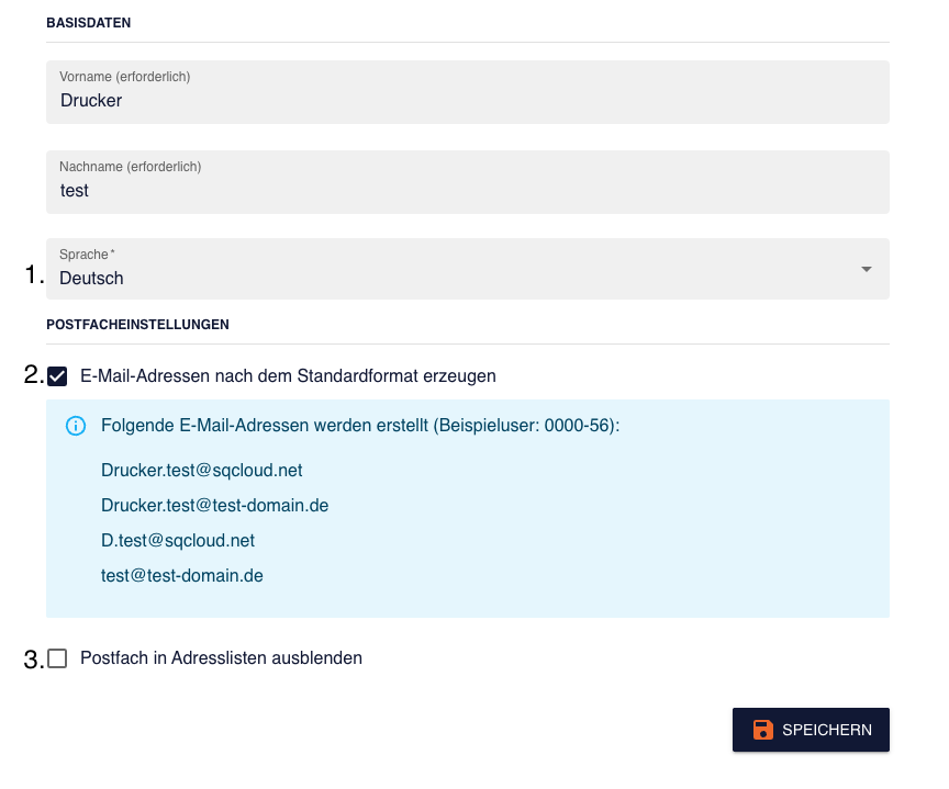 Sie können entweder die E-mail Adresse generieren lassen nach dem Standardformat, oder eine eigene Adresse verwenden. Das Standardformat wird nach dem Template festgelegt, welches Ihr Unternehmen für solche Prozesse bevorzugt. Es werden dazu Beispieladressen aufgeführt.