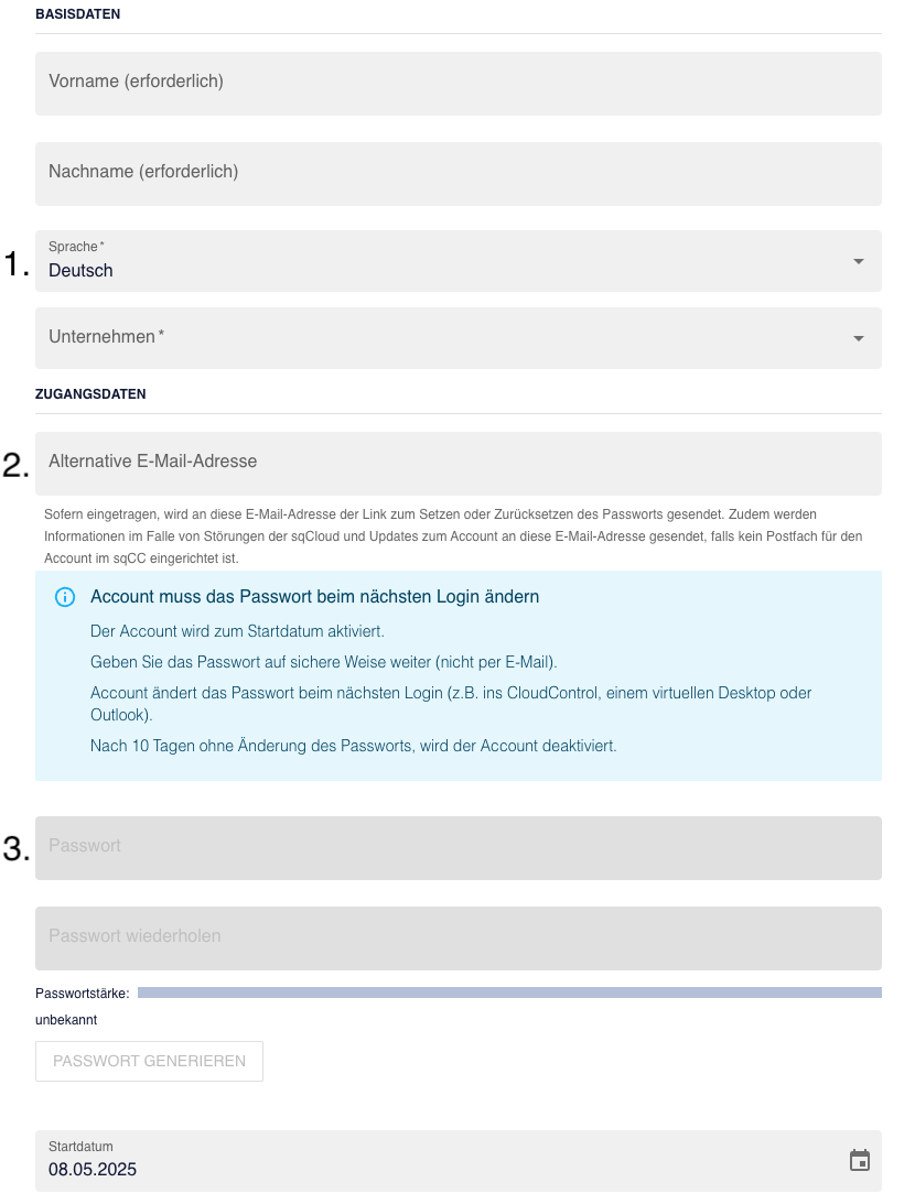 Damit der Account einen Link zum Setzen des Passwortes erhalten kann, muss hier eine E-Mail Adresse des Benutzers eingetragen werden, die nicht von SQUILD stammt (z.B. eine private Adresse). Wenn keine Adresse eingetragen wird, muss von Ihnen ein (initiales) Passwort gewählt und an den Benutzer weitergegeben werden. (Siehe auch [Hier dann Link zu unserer Erklärung zum Passwort-Prozess])