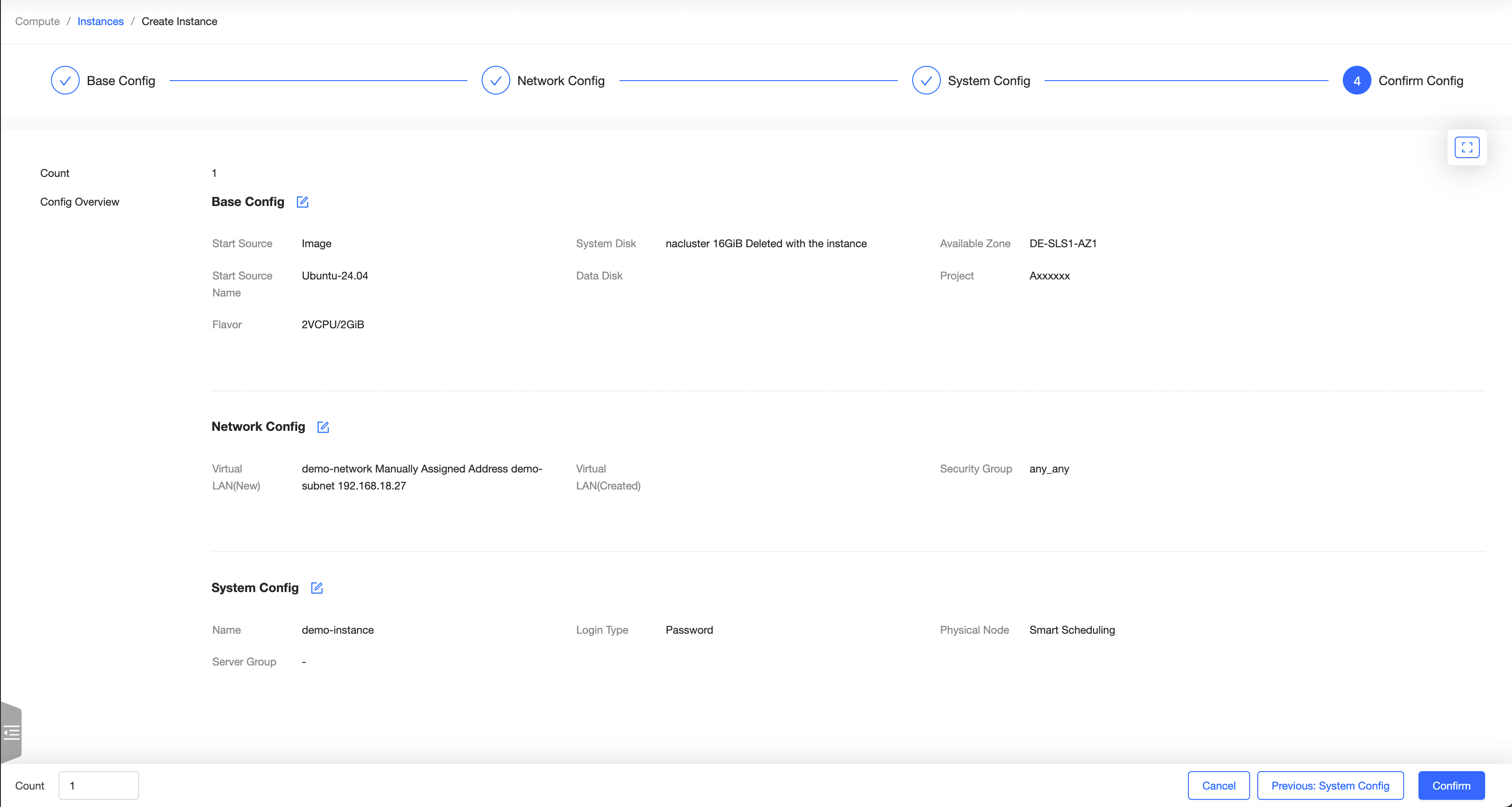 Im letzten Schritt wird eine Übersicht über die gewählte Konfiguration angezeigt. Diese kann durch Betätigen der Schaltfläche „Confirm“ bestätigt werden.