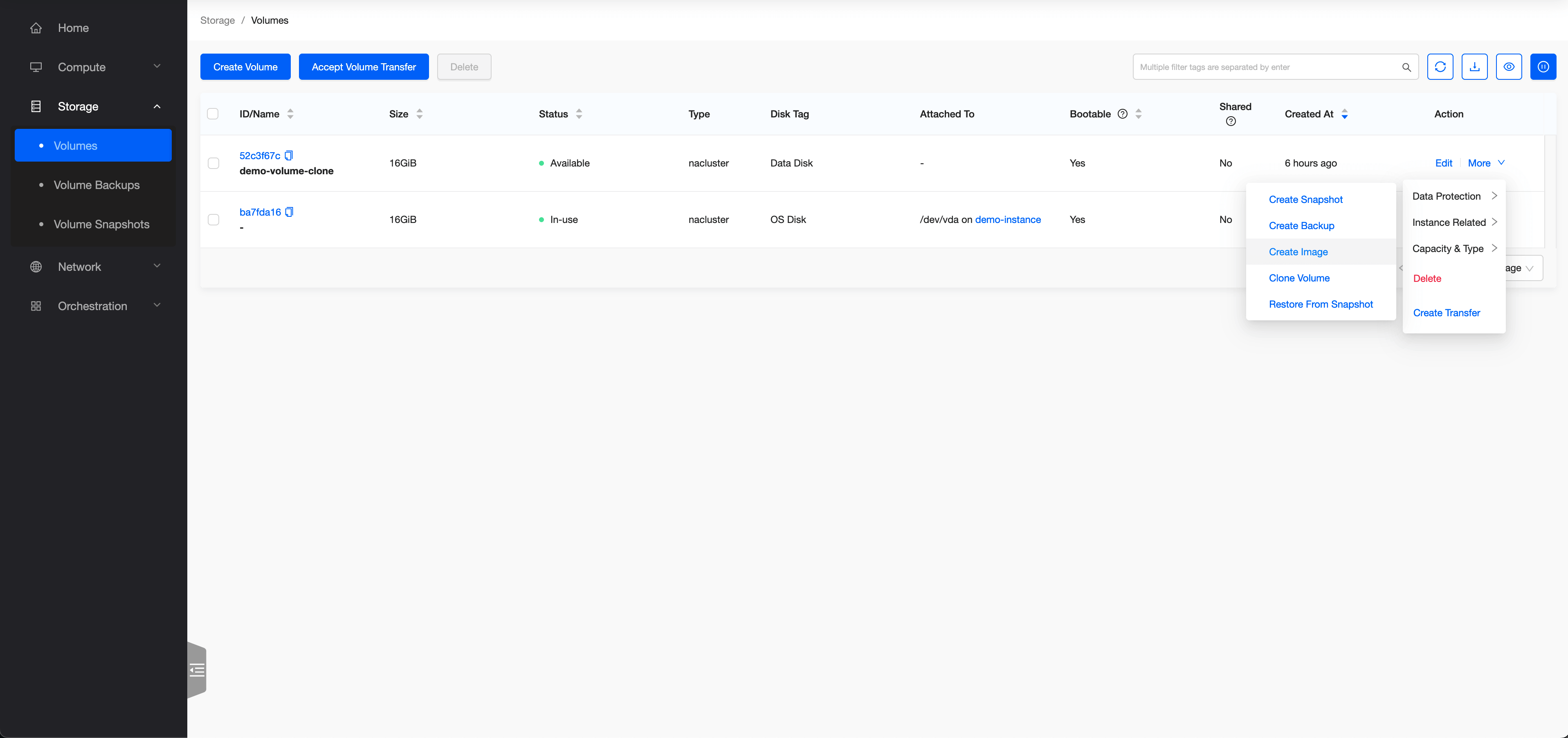 Ist das Betriebssystem vorbereitet und heruntergefahren, so kann unter Storage / Volumes die zugehörige Systemfestplatte identifiziert werden. Diese ist an die Instance angehängt (Attached To „/dev/... on ...“) und kann daher nicht direkt verwendet werden. Stattdessen muss zunächst über „More“ – „Data Protection“ – „Clone Volume“ ein Klon des Volumes angefertigt werden.