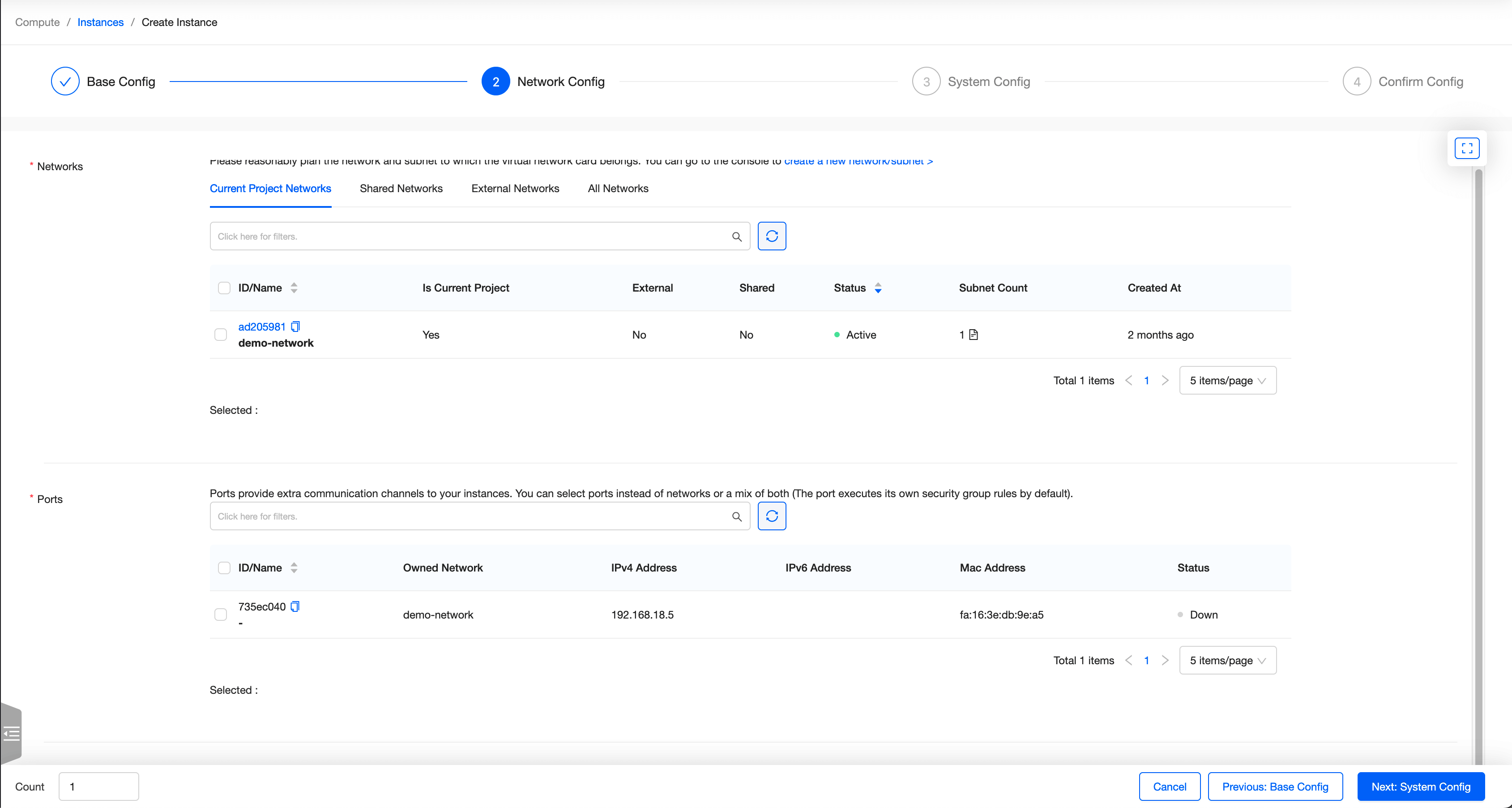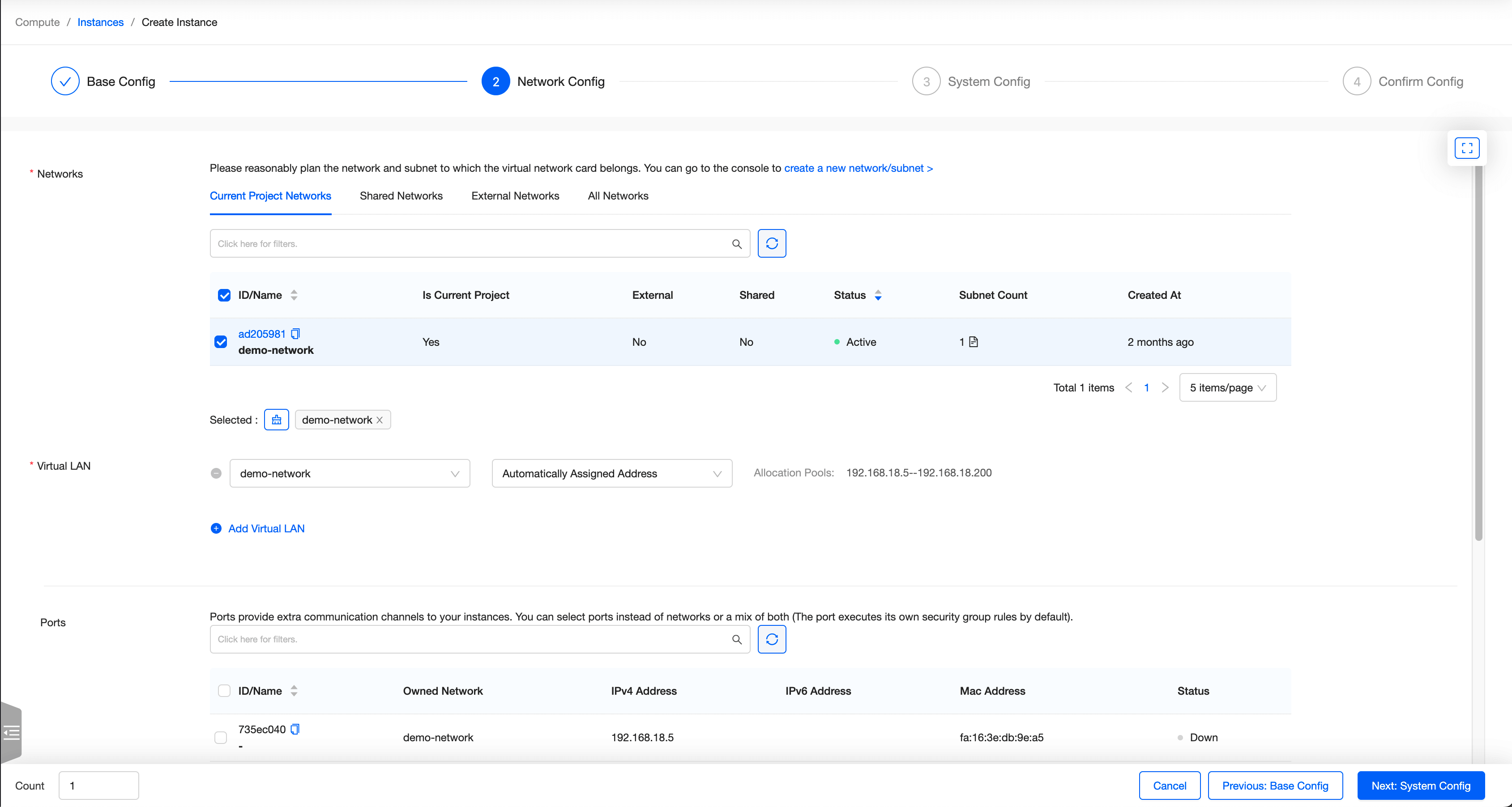 Unter verfügbaren Netzwerken stehen alle dem Kunden zur Verfügung stehenden Netzwerke zur Auswahl bereit. Dies umfass sowohl Projekt-interne Netzwerke als auch geteilte und externe Netzwerke, die für den Kunden freigegeben wurden. Die Verfügbarkeit geteilter oder externer Netzwerke hängt von den konkreten geschlossenen Verträgen ab.Nach Auswahl eines Netzwerks kann zwischen einer automatischen oder einer manuellen Adresszuweisung und ggf. konfigurierten Subnets gewählt werden.
