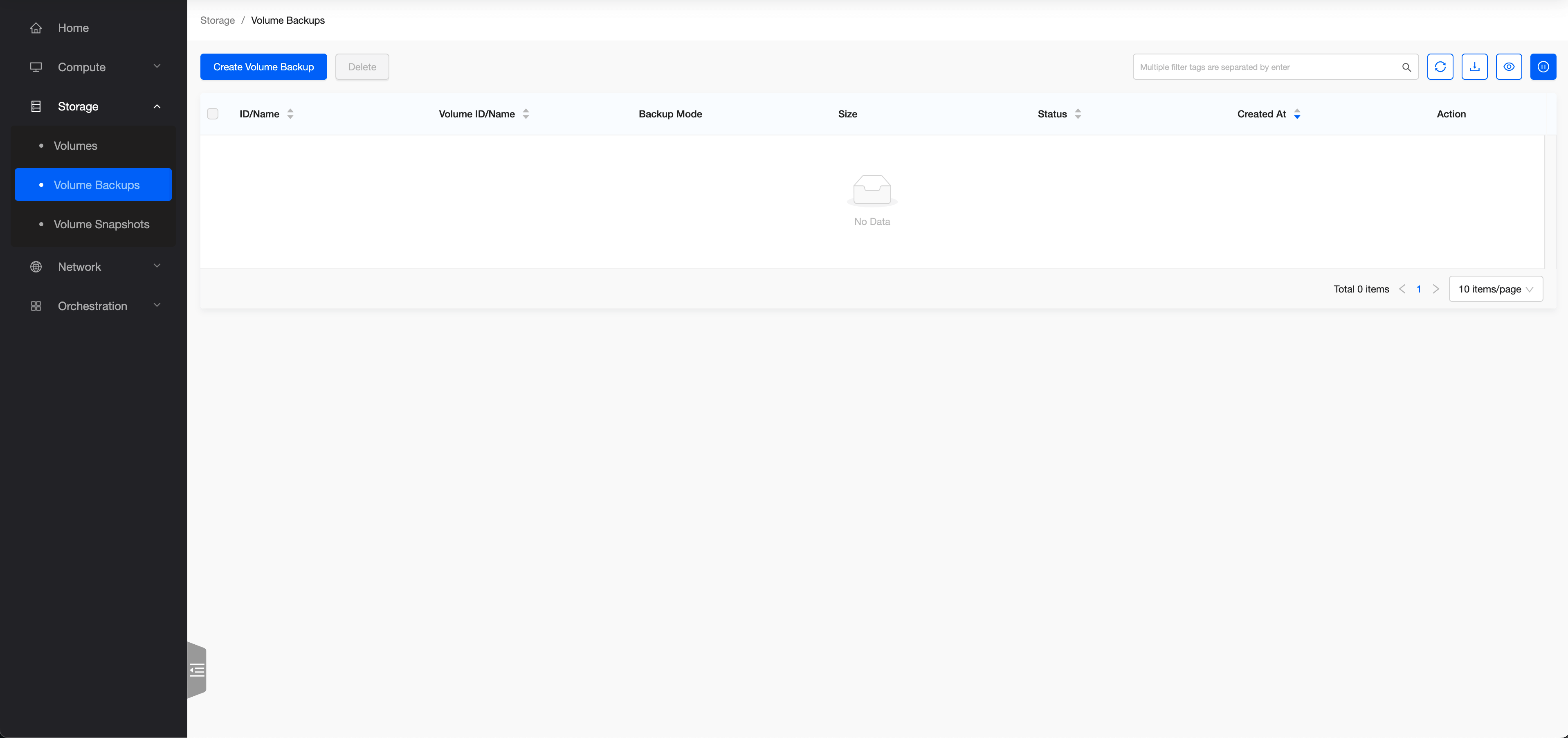 Unter dem Menüpunkt Storage / Volume Backups können Volume Backups verwaltet werden.