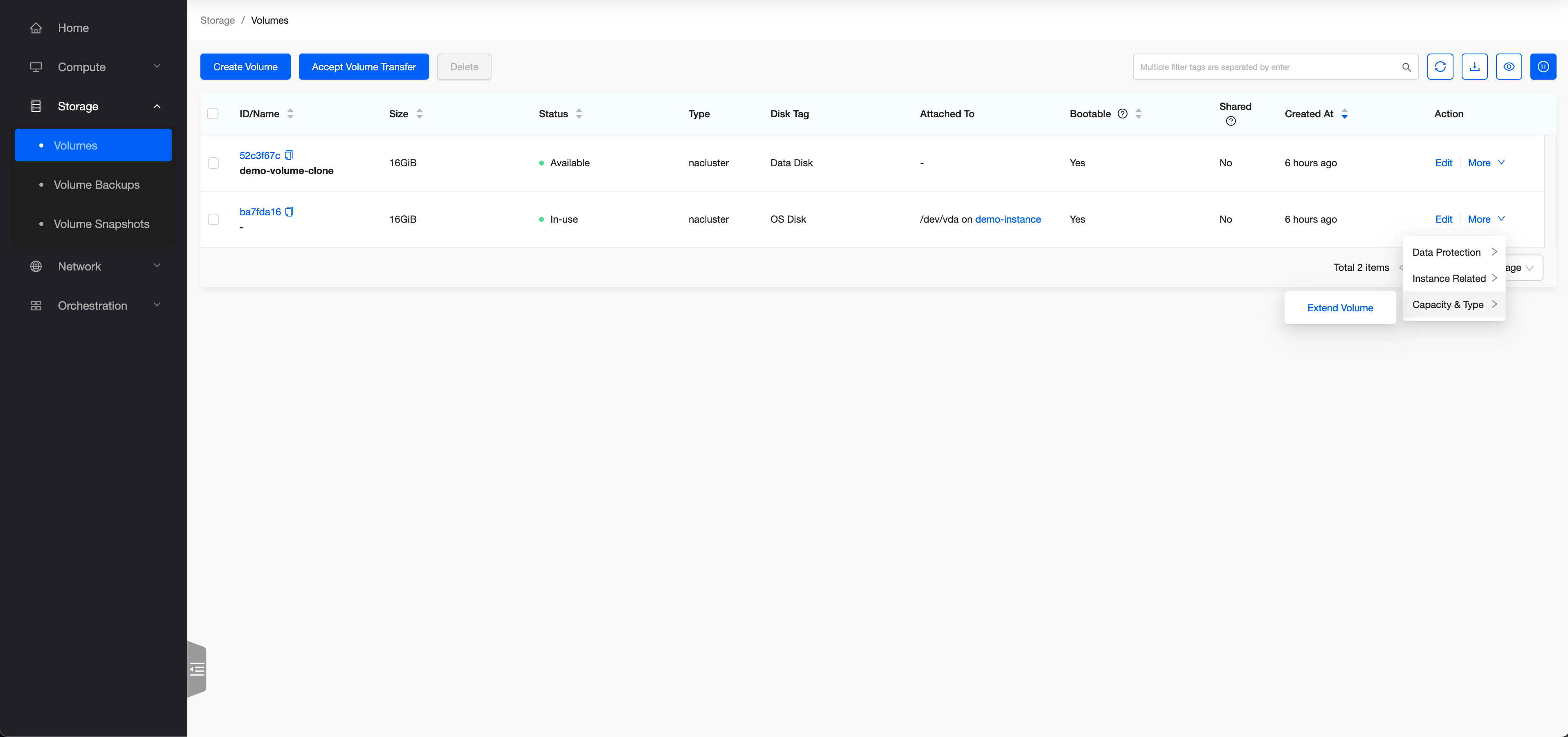 Unter „More“ – „Capacity & Type“ kann über „Extend Volume“ die Größe des Volumes erweitert werden.