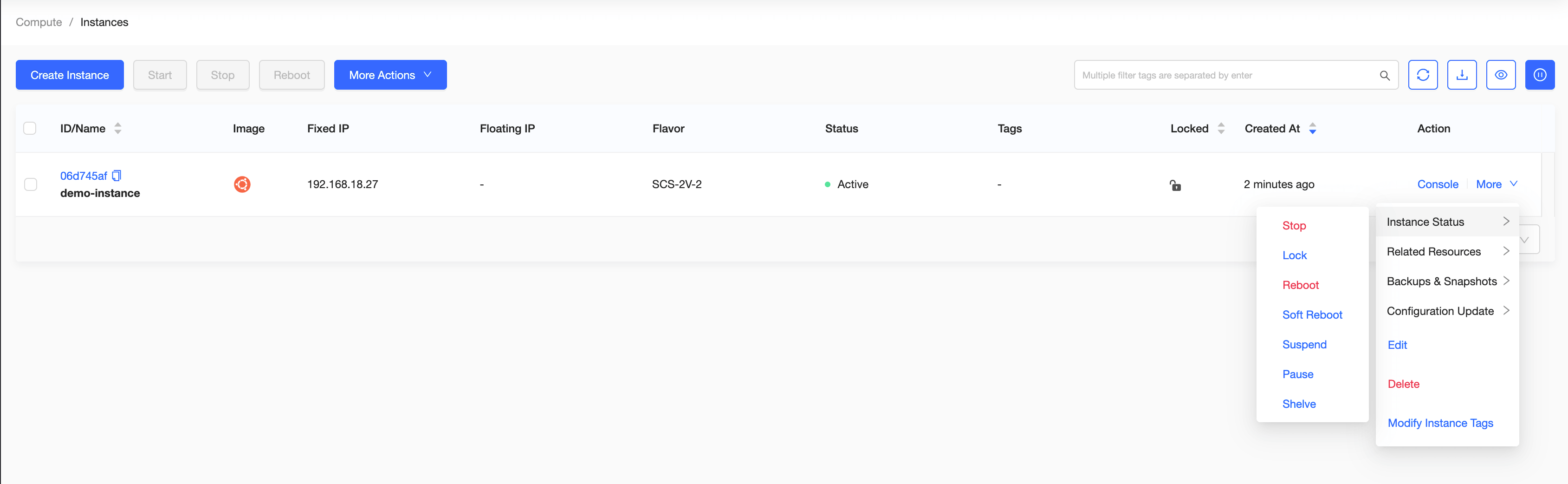 Bestehende Instances können über das Instance-spezifische Menü „More“ gesteuert werden. Optionen zum Starten („Start“), Stoppen („Stop“) und Neustarten („Reboot“, „Soft Reboot“) einer Maschine sind unter „More“ – „Instance Status“ sofern verfügbar zu erreichen.