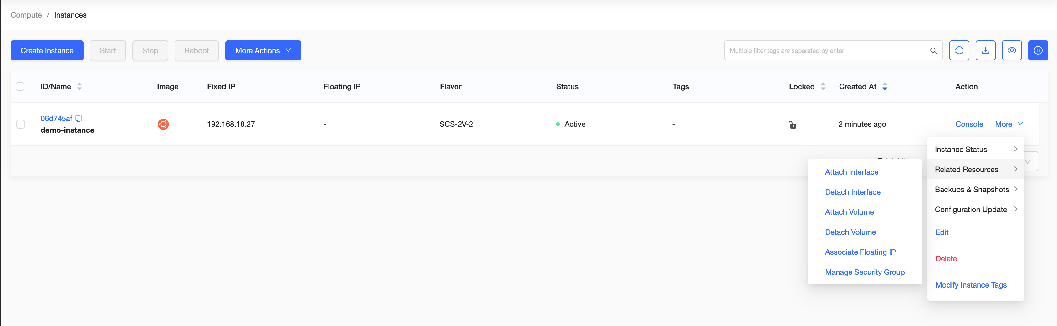 Unter „More“ – „Related Resources“ können Netzwerk Adapter („Attach Interface“ / „Detach Interface“) sowie weitere virtuelle Volumes („Attach Volume“ / „Detach Volume“) hinzugefügt oder entfernt werden. Hierbei gilt zu beachten, dass es aus Gründen der Performanz empfohlen ist, wenige größere Volumes vielen kleinen Volumes vorzuziehen.