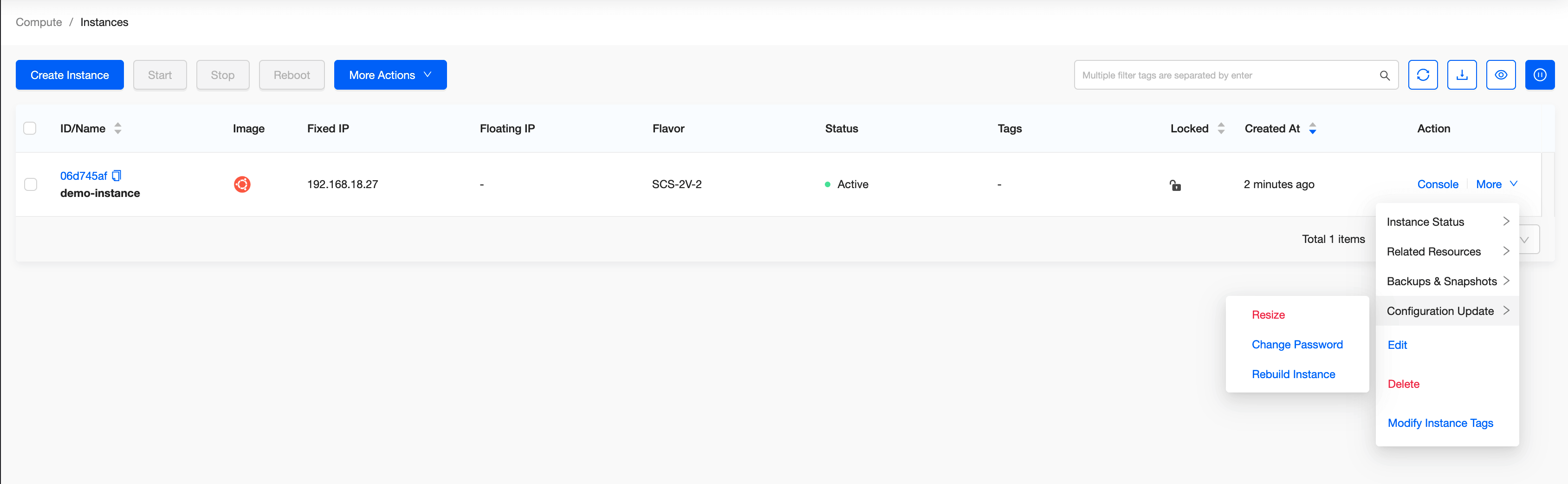 Unter „More“ – „Configuration Update“ kann die Konfiguration der Instance geändert werden. Die Option „Resize“ erlaubt beispielsweise ein nachträgliches Ändern des gewählten Flavors.