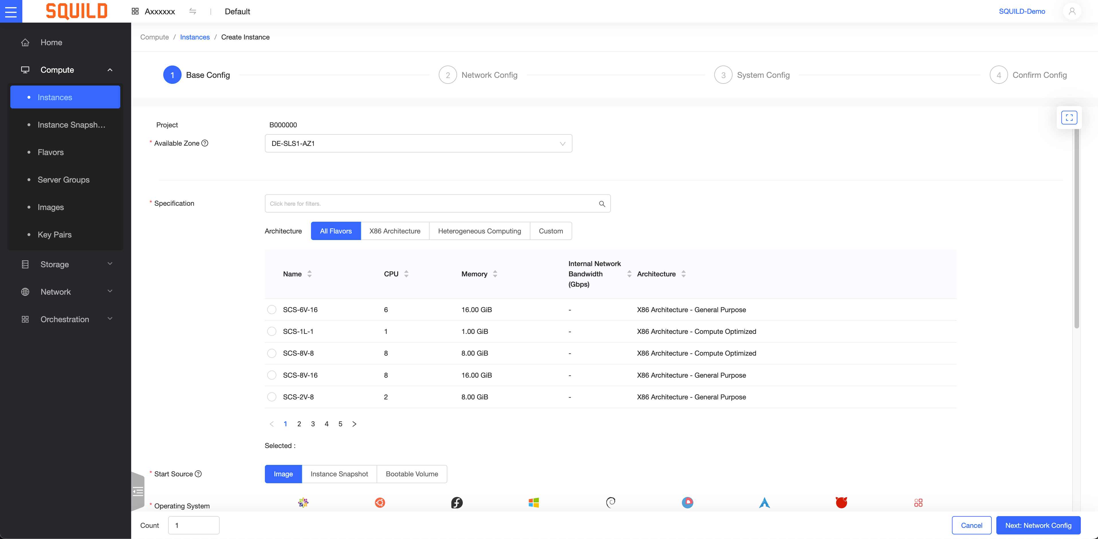 Unter Start Source kann die Quelle gewählt werden, aus der die Instance erzeugt werden soll. Im Regelfall ist dies ein Image. Ist diese Option als Quelle gewählt, so kann im nächsten Abschnitt ein Image als Operating System gewählt werden.