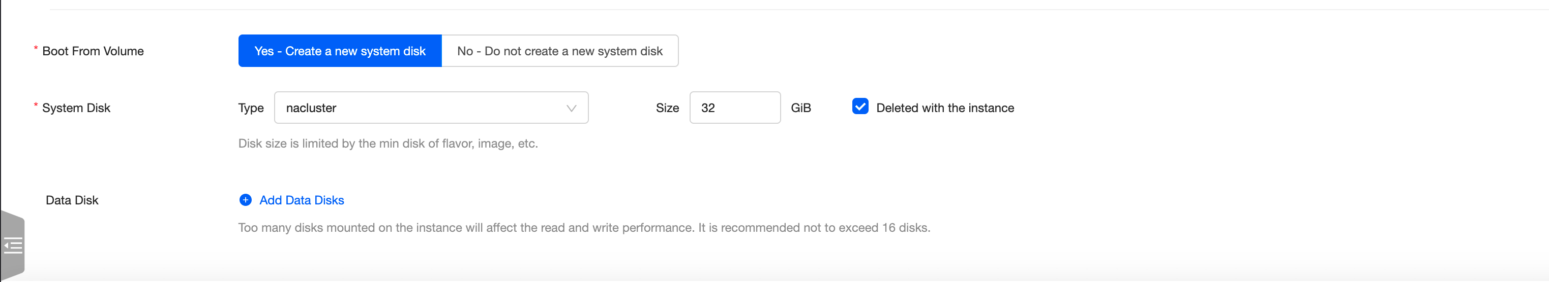 Die Auswahl von „Deleted with the instance“ legt fest, dass das Volume automatisiert mit der Instance gelöscht wird. Diese Option ist mit Sorgfalt zu wählen.