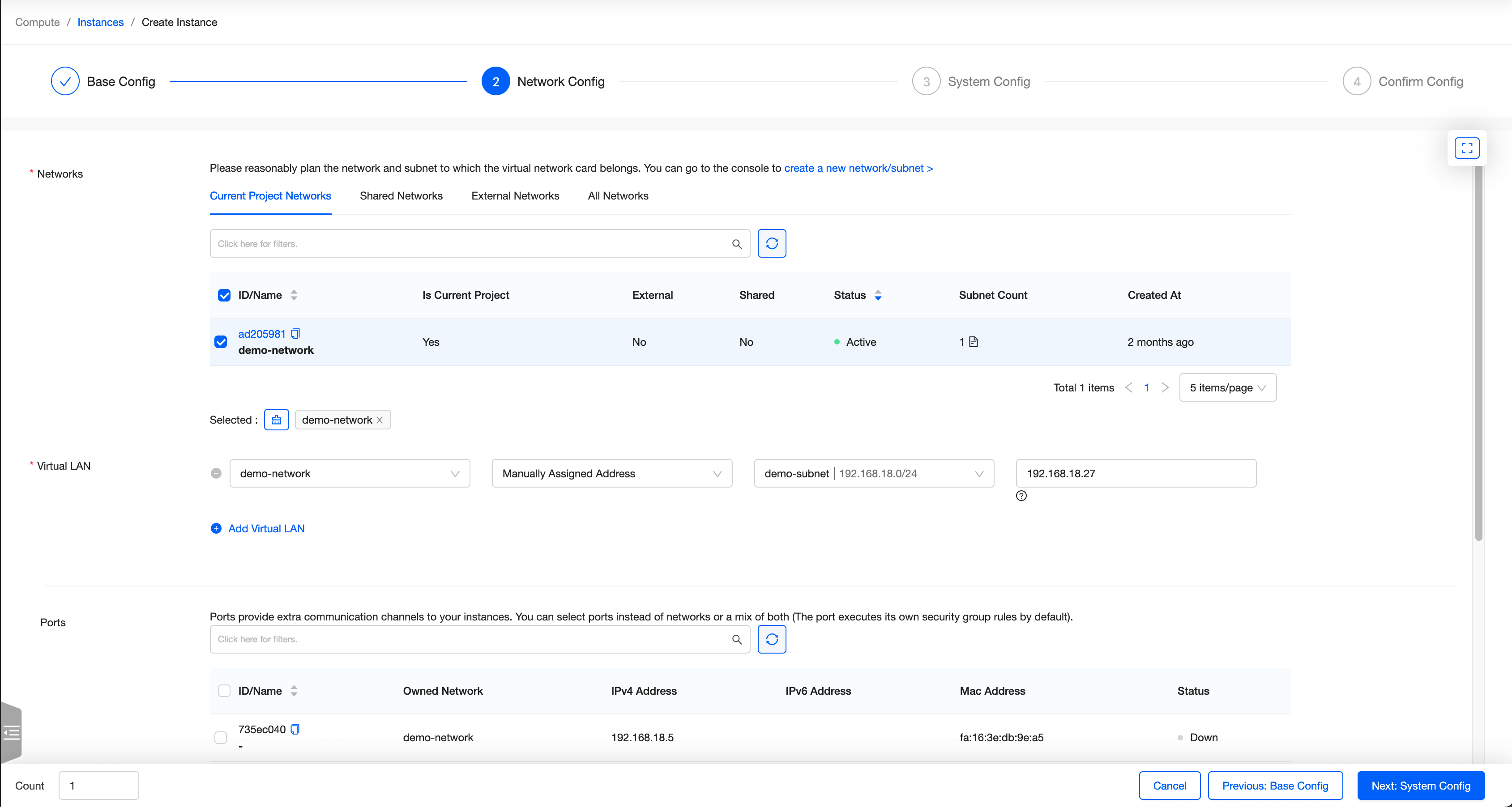 Unter verfügbaren Netzwerken stehen alle dem Kunden zur Verfügung stehenden Netzwerke zur Auswahl bereit. Dies umfass sowohl Projekt-interne Netzwerke als auch geteilte und externe Netzwerke, die für den Kunden freigegeben wurden. Die Verfügbarkeit geteilter oder externer Netzwerke hängt von den konkreten geschlossenen Verträgen ab.