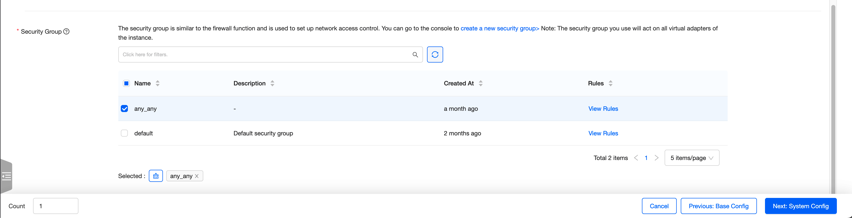 • Auswahl der Security Group