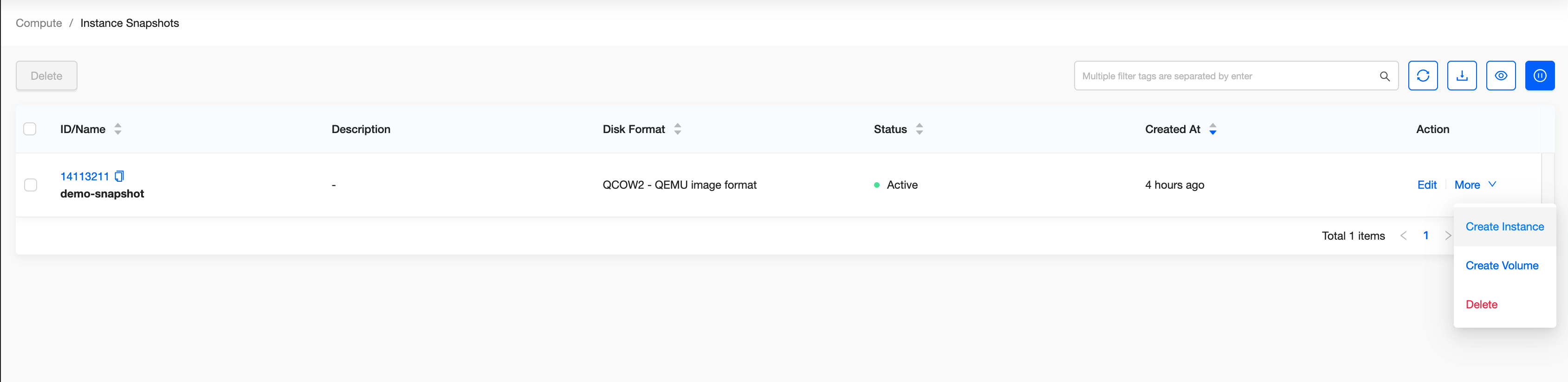 Unter dem Menüpunkt Compute / Instance Snapshots kann eine Liste bestehender Snapshots eingesehen werden.